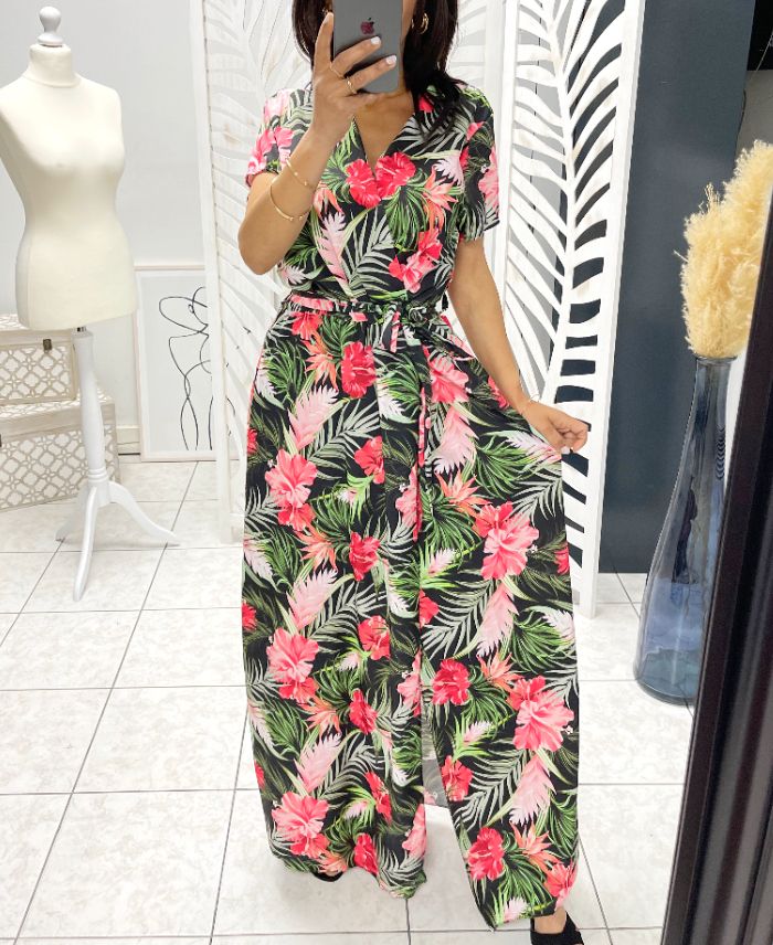 TROPISCHES LANGES KLEID MIT SCHLITZ PE1283 SCHWARZ