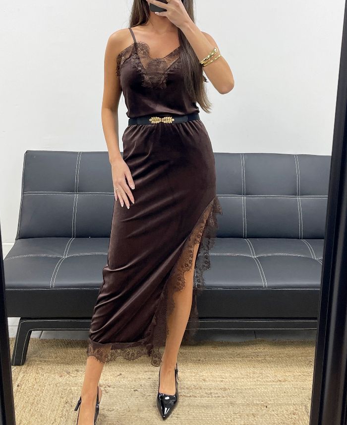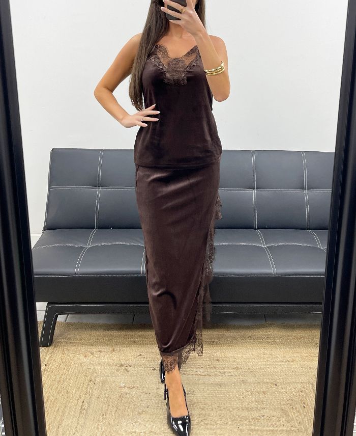 LANGER SPITZENROCK AUS SAMT MIT SCHOKOLADENSCHLITZ AH250675