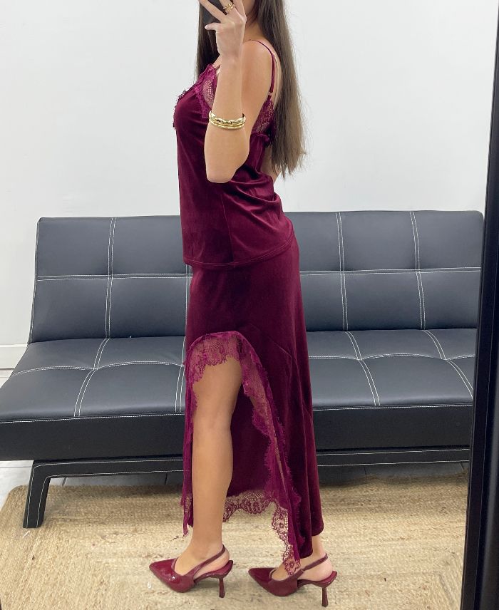 LANGER ROCK AUS SAMT MIT SPITZENSCHLITZ AH250675 BURGUNDERROT