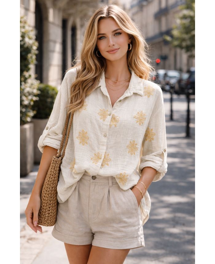 BAUMWOLL-GAZENHEMD STICKEREI PE2414 BEIGE