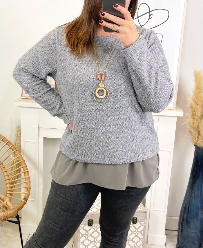 GLOSSY SWEATER LAYERED WITH NECKLACE 9164 GREY