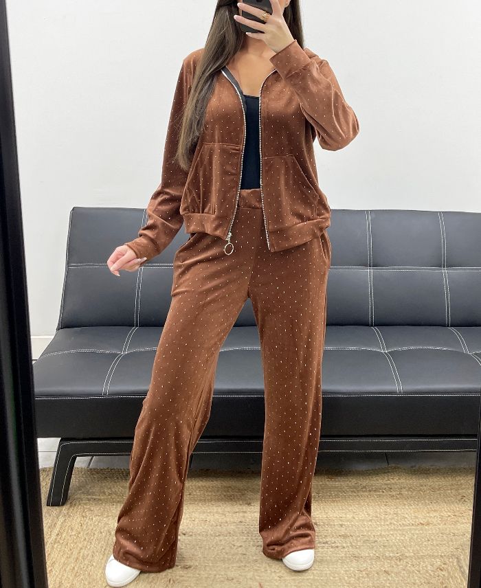 HOODED VEST + 2-POCKET TROUSERS SET WITH CHOCOLATE STUDDED VELVET AH36382