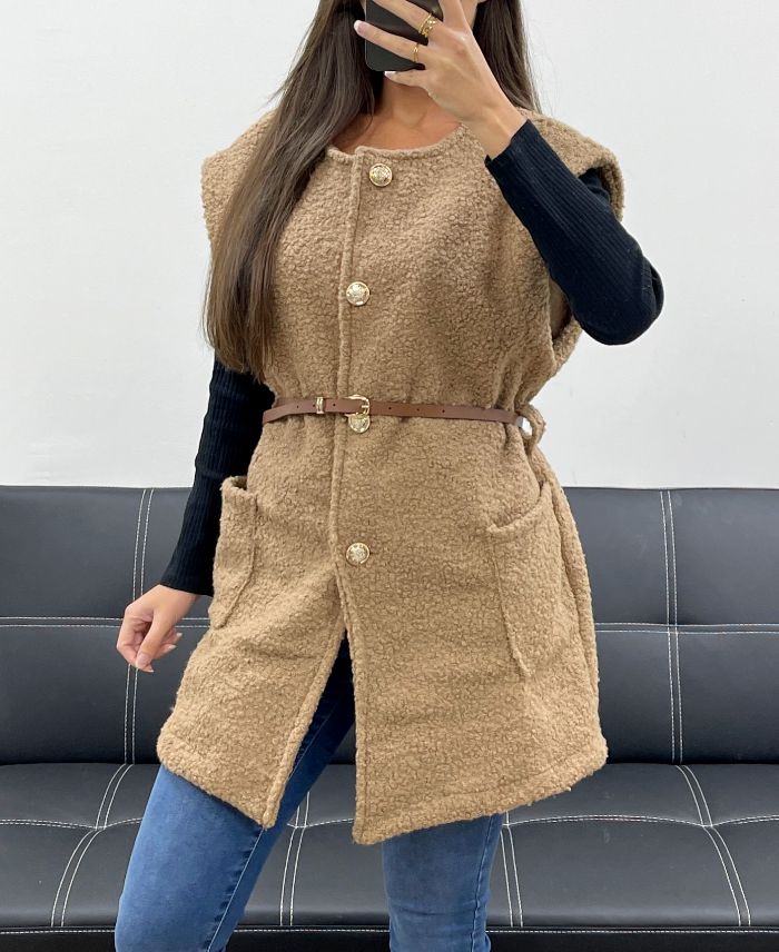 SLEEVELESS JACKET IN BUCKLED WOOL + BELT AH255226 CAMEL