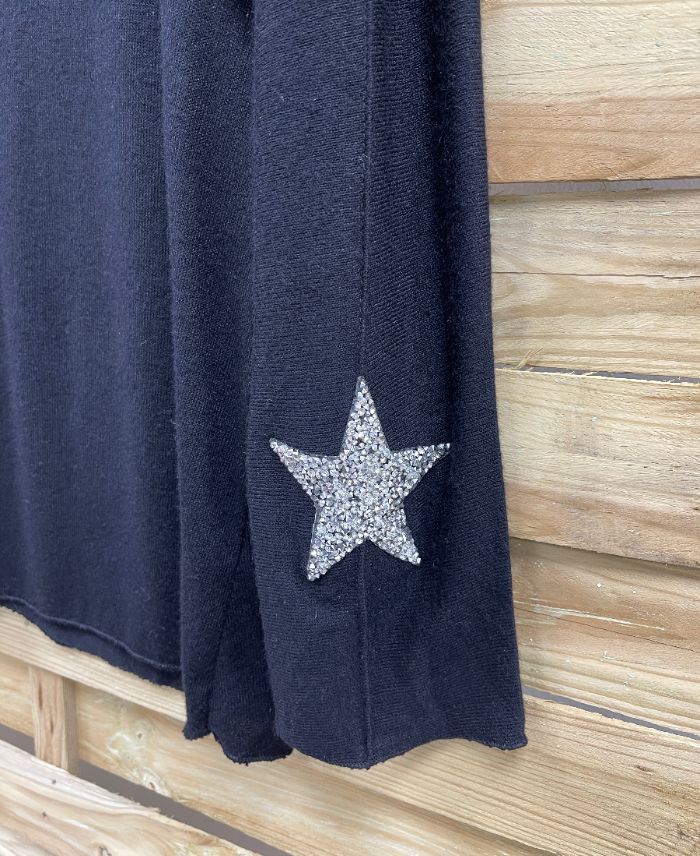 LIGHTWEIGHT RHINESTONE STAR FLOCKING SWEATER PE2424 BLACK
