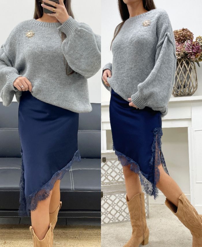 FALDA ASIMÉTRICA DE SATÉN ENCAJE AH36284 AZUL MARINO