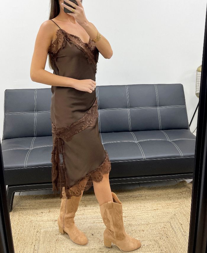 FALDA ASIMÉTRICA DE SATÉN ENCAJE AH36284 CHOCOLATE