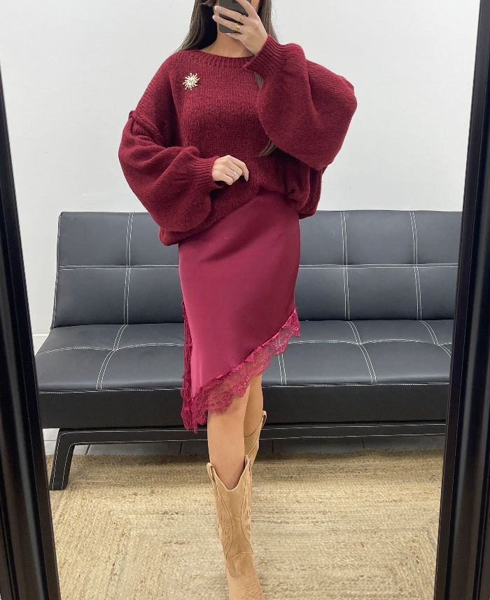 FALDA ASIMÉTRICA DE SATÉN DE ENCAJE AH36284 BURDEOS