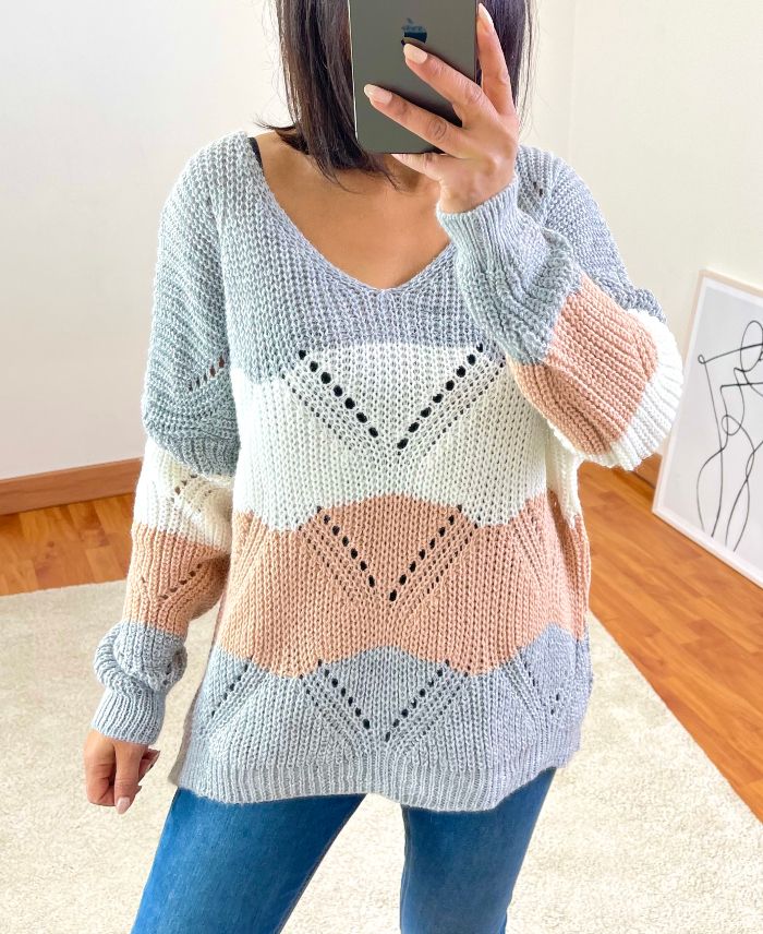 JERSEY CON CUELLO EN V AJOUR MULTICOLOR GRIS R19A