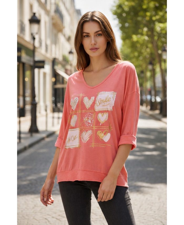 CAMISETA SMILE BIMATERIAL DE ALGODÓN-LINO PE0818 CORAL