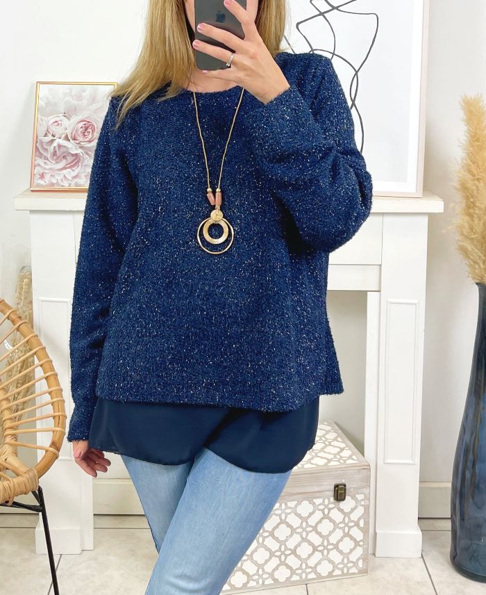 PULL BRILLANT SUPERPOSE OVERSIZE AVEC COLLIER 9164 BLEU