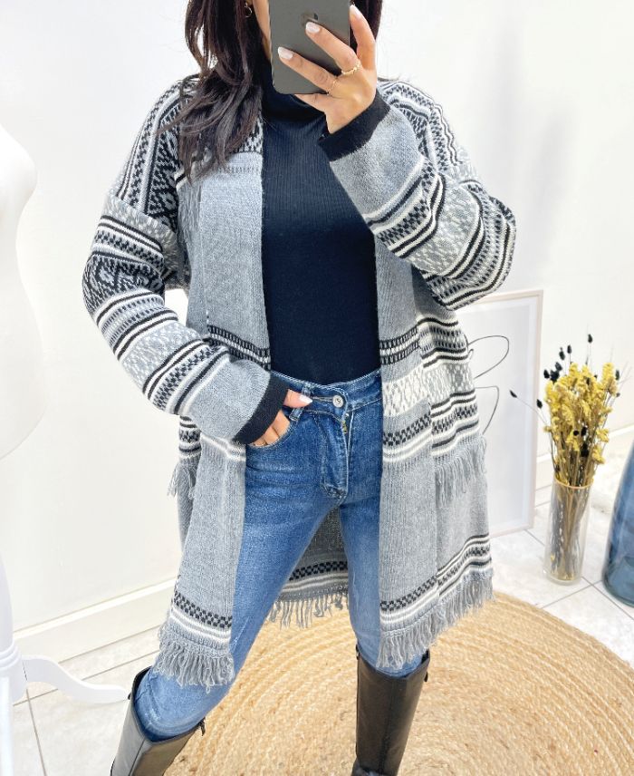 GILET IMPRIME ETHNIQUE FRANGES AH764 GRIS