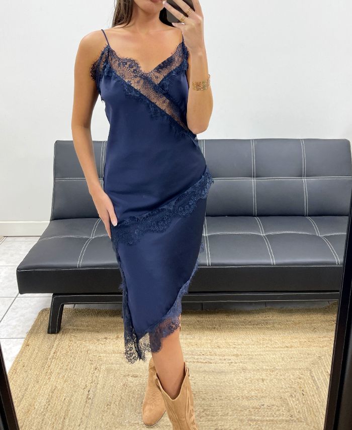 JUPE SATIN ASYMETRIQUE DENTELLE AH36284 MARINE