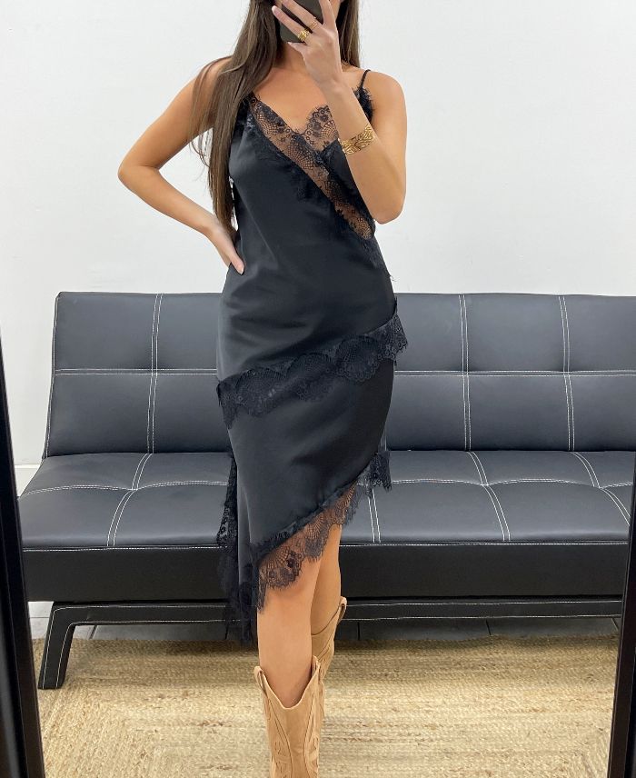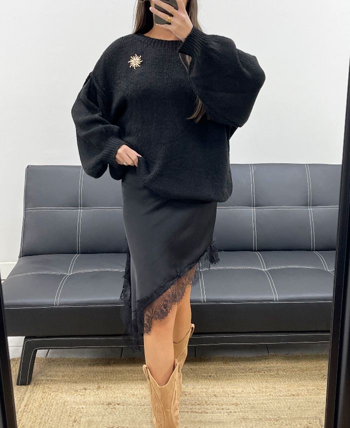 JUPE SATIN ASYMETRIQUE DENTELLE AH36284 NOIR
