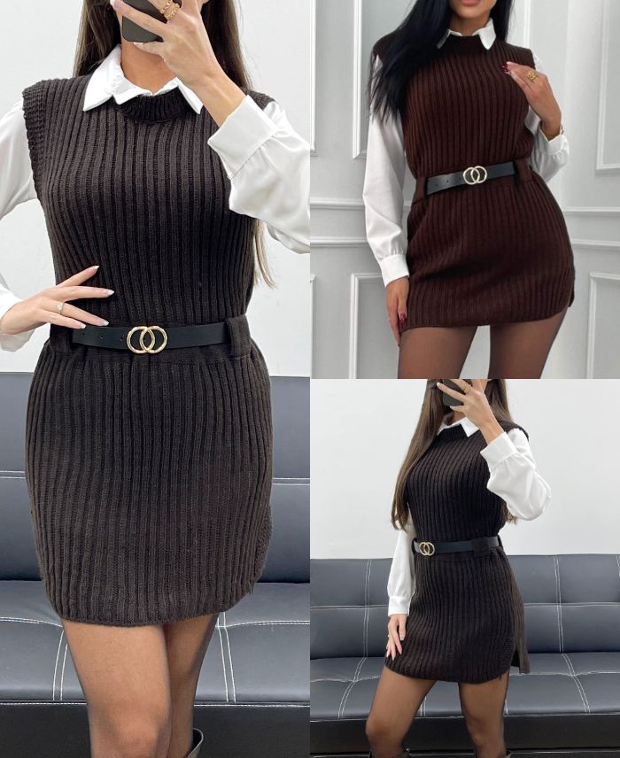 ENSEMBLE 3 PIECES PULL LONG + CHEMISE + CEINTURE AH250655 MARRON