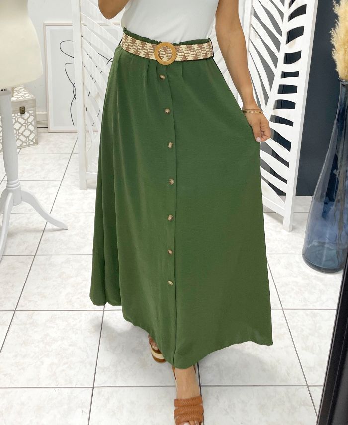 JUPE LONGUE A BOUTONS + CEINTURE AJUSTABLE PE2040 VERT MILITAIRE