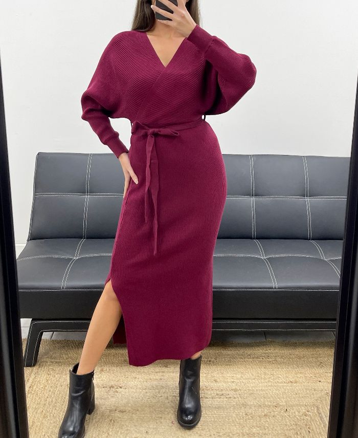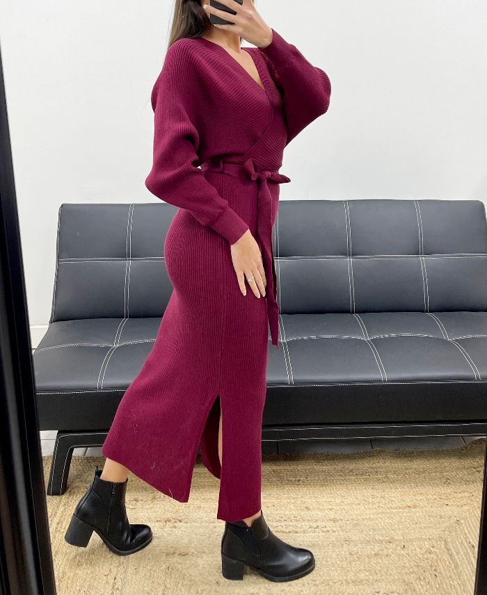 ABITO LUNGO IN MAGLIA A COSTINE CON PARABORDI + CINTURA AH250645 BORGOGNA