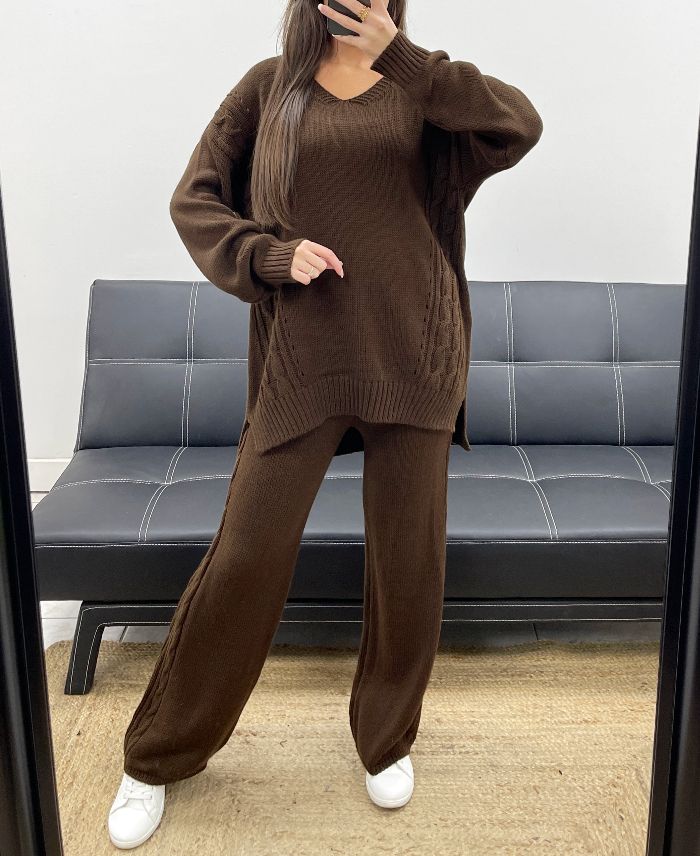 SET MAGLIONE IN MAGLIA TAGLIE FORTI + PANTALONI AH250721 CIOCCOLATO