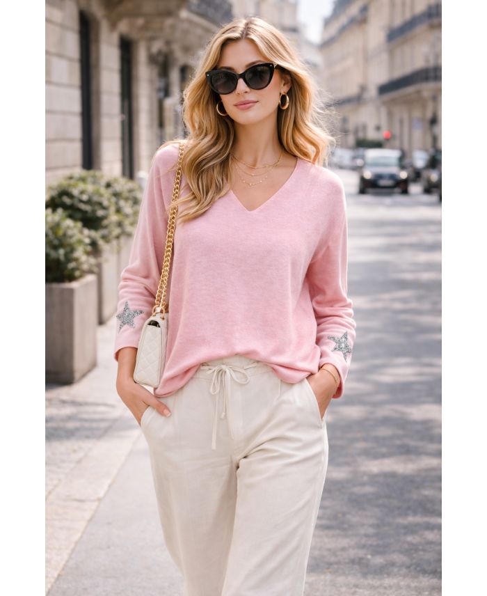 MAGLIONE LEGGERO A STRASS A STIRPE A STO PE2424 ROSA