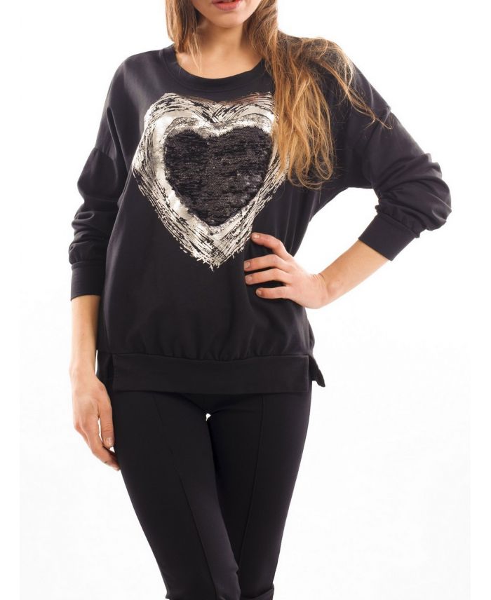 T-SHIRT COEUR SEQUIN METALISE S7036 NOIR