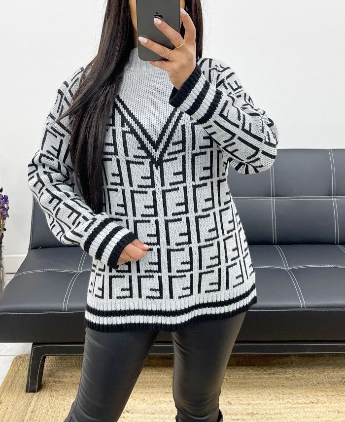 TRUI MET GEOMETRISCH PATROON EN HOGE KRAAG AH857 GRIJS