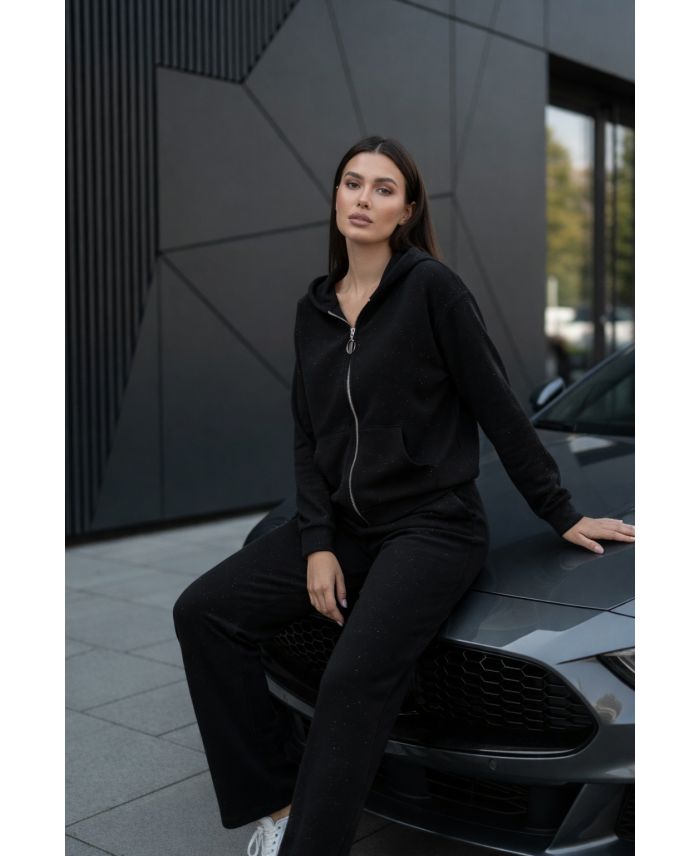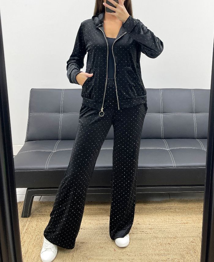 VEST MET CAPUCHON + 2-POCKET BROEK SET ZWART FLUWEEL MET STUDS AH36382