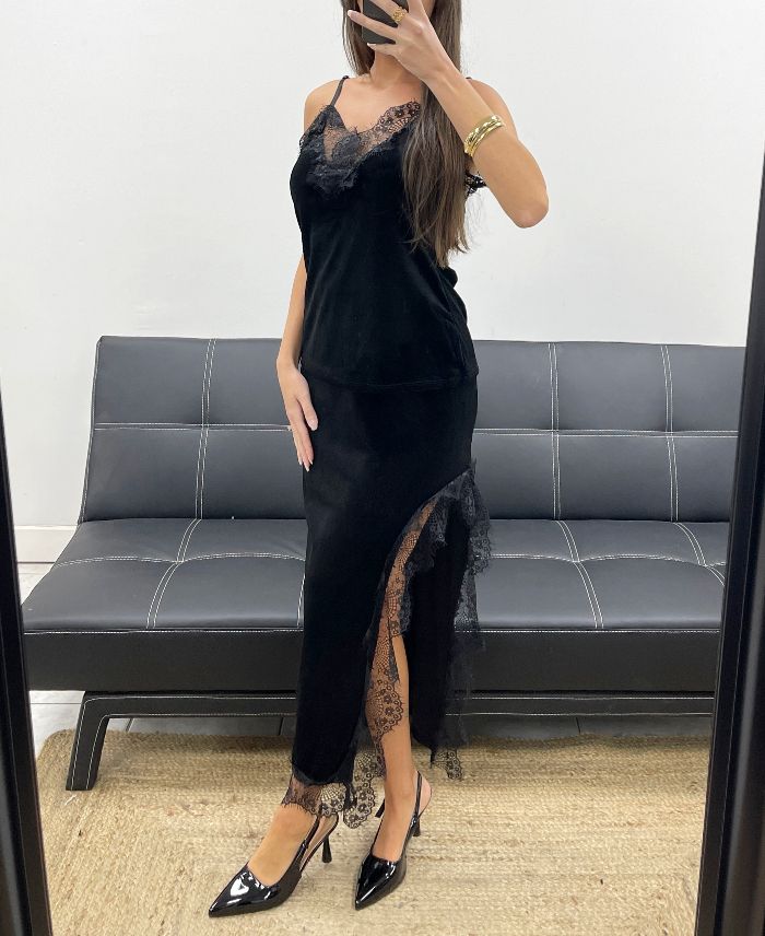 LANGE FLUWELEN KANTEN ROK MET ZWARTE SPLIT AH250675