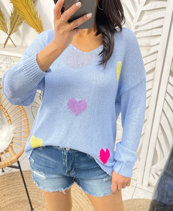 KLEURRIJKE HARTJES GEBREIDE TRUI PE451 HEMELSBLAUW