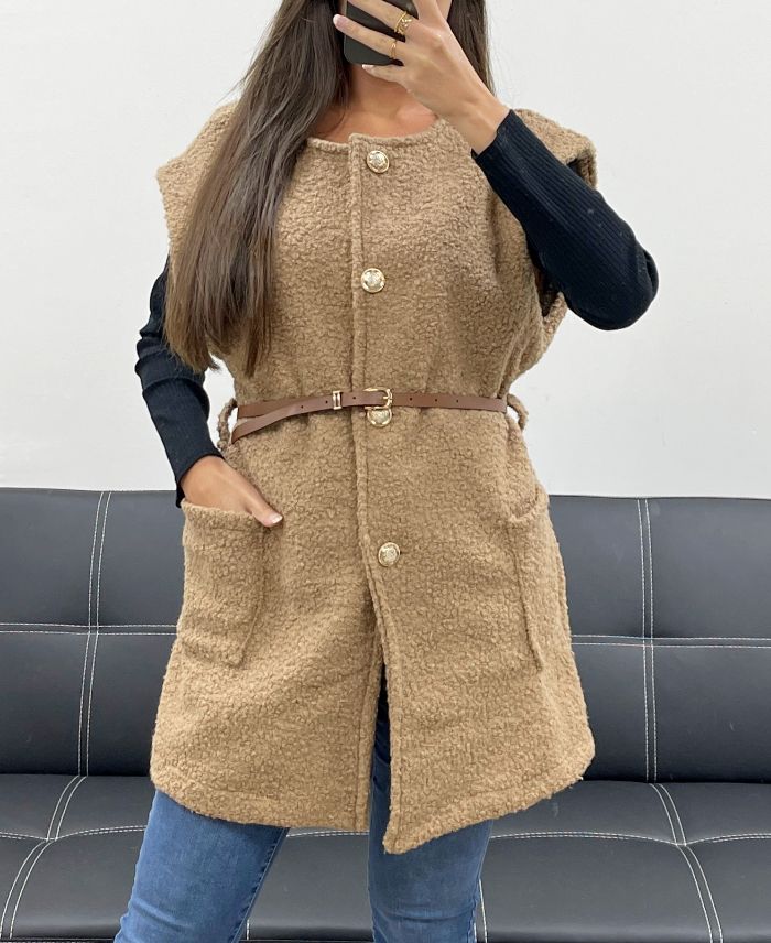 KURTKA BEZ RĘKAWÓW Z WEŁNY ZE SPRZĄCZKAMI + PASEK AH255226 CAMEL