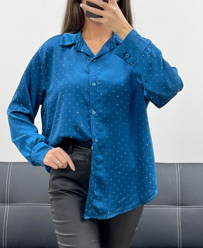 NIEBIESKA SATYNOWA KOSZULA Z ĆWIEKAMI W KOLORZE AH250621
