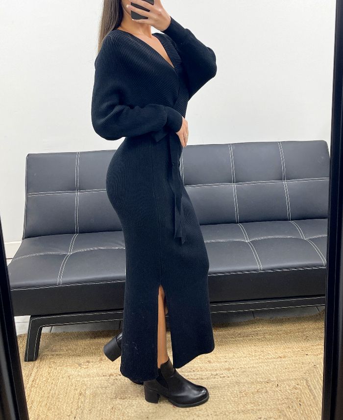 DŁUGA SUKIENKA Z PRĄŻKOWANEJ DZIANINY Z ROZCIĘCIAMI + AH250645 PASEK