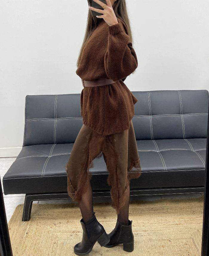 ASYMETRYCZNA KORONKOWA SATYNOWA SUKIENKA Z CZEKOLADOWYM ROZCIĘCIEM AH250685