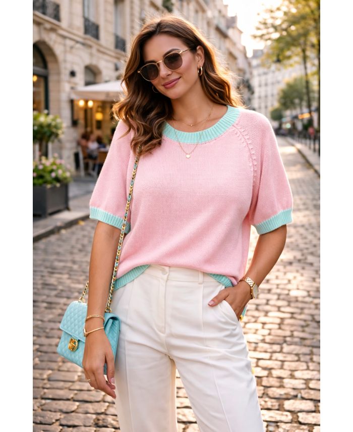 SZYKOWNY DWUKOLOROWY SWETER TRICOL PE260636 PINEK/ZIELONY